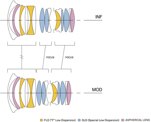 24mm Art采用11组15片光学结构,内含3片FLD镜片、4片SLD镜片,另外还有2片非球面镜片,其中1片还被放到了镜头的最尾端,可确保最小的画面失真并控制轴向色差。9叶片圆形光圈,最近对焦距离约25cm。