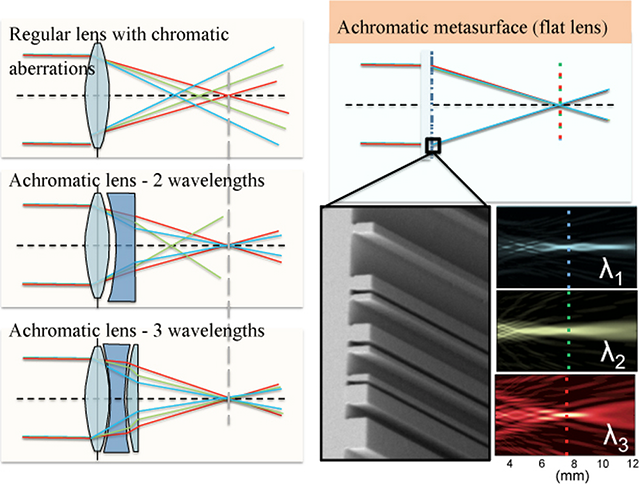 左:色差原理及复合消色差原理,右:平面消色差元件原理及表面显微结构