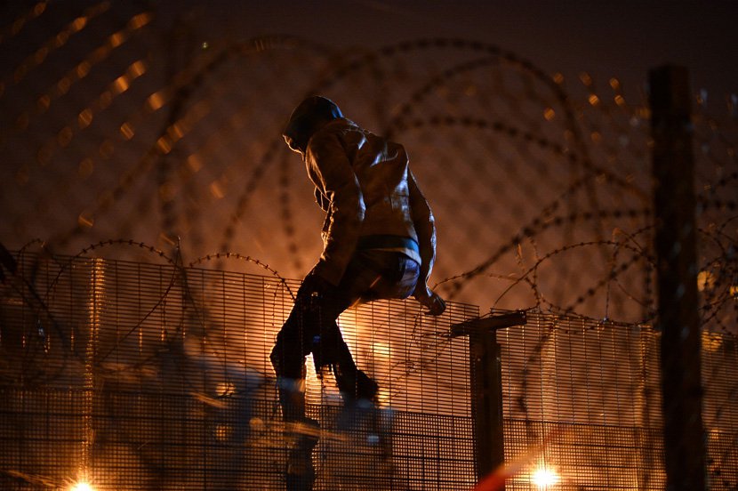 作品:A man climbs the security fence in Calais