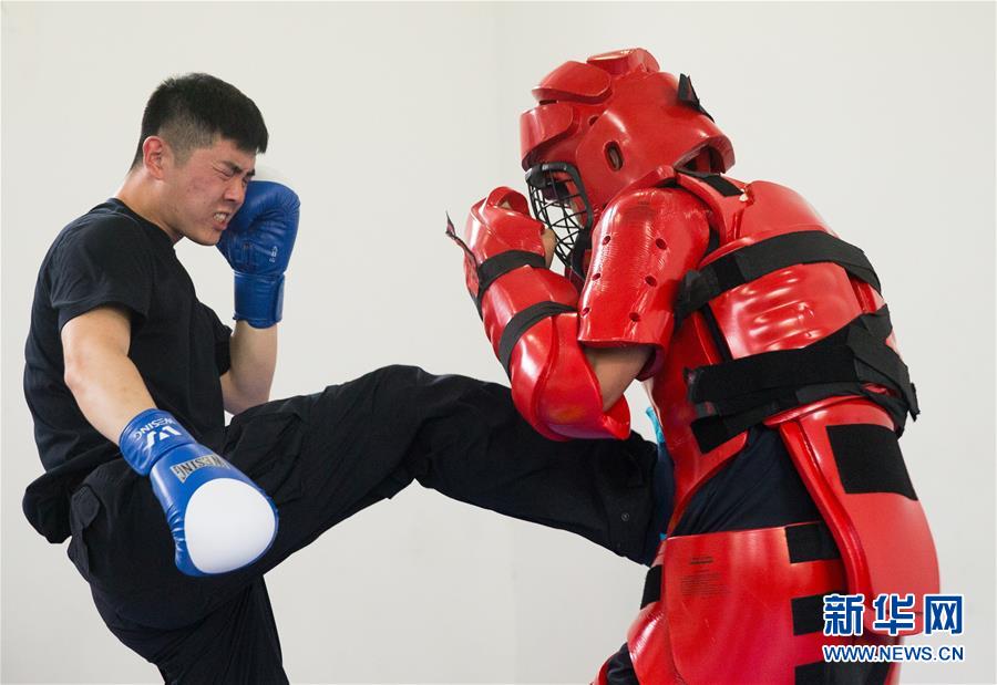 7月27日,东航安全员孙世常青(左)在进行对抗训练。他在加盟东航之前是解放军三军仪仗队的一员。今年年初,首批24名解放军优秀退伍士兵加盟东航,成为专职航空安全员?!鞍艘弧苯ň谇跋?,记者再次来到中国东方航空公司,在日常训练和工作中近距离感受这群退伍军人的华丽转身。新华社记者裴鑫 摄