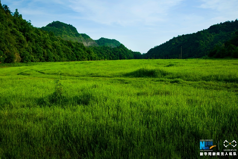 在新华网无人机的镜头下,江西抚州广昌丹霞地貌的绿水青山、远处几户人家、山间一片草地,渲染出一幅人与自然和谐相处的画卷。新华网杨益民摄 飞手 江远宾