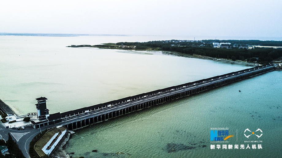 洪泽湖大堤是世界文化遗产,位于江苏省淮安市,全长70余公里,距今已有1800年的历史,被誉为“水上长城”??罩懈╊樵蠛蟮蹋蟮萄刈藕骝暄亚巯蚰?,大堤之上树木成林、郁郁葱葱。大堤一侧渔船点点;大堤另一侧是城市、村庄、麦田、鱼塘。傍晚时分,夕阳洒在湖面上,湖水像是镀了层金。新华网发应小兰摄