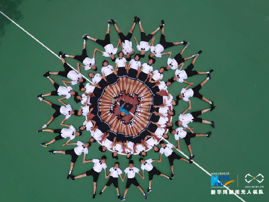毕业前夕,广州市天河区前进小学,一个毕业班的学生在校园篮球场上拍摄毕业照。新华网发 凌志摄