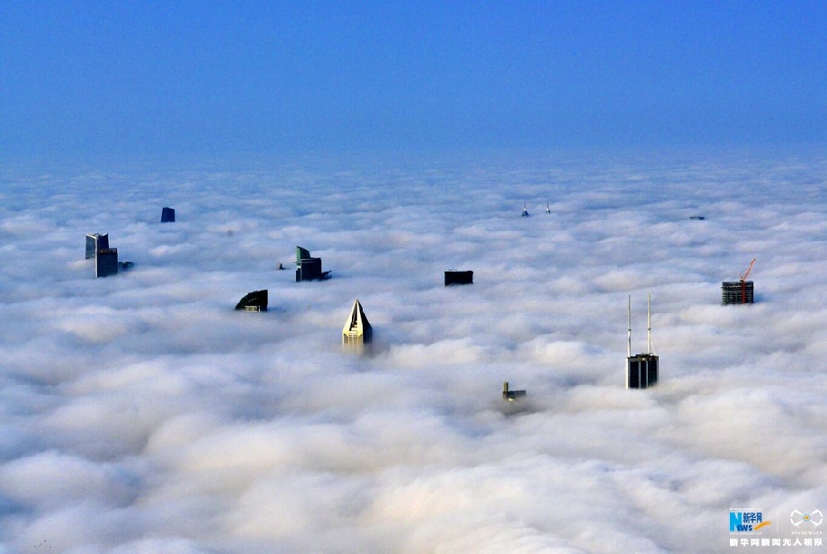 图为无人机航拍繁华之都上海,高楼大厦穿过云天。新华网发 黄伟国摄