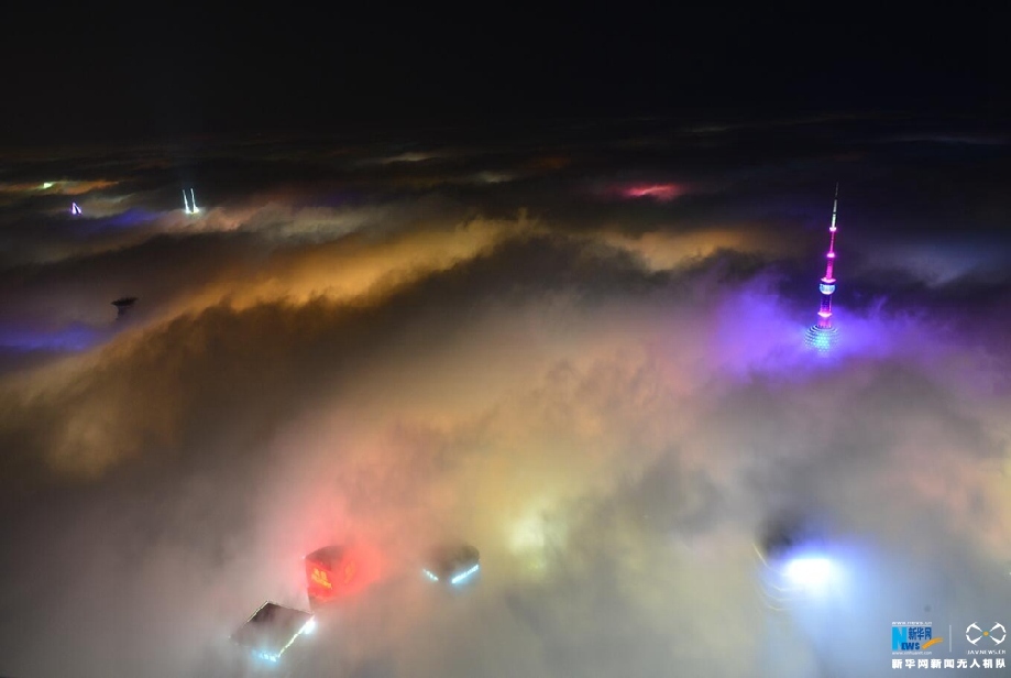 图为晚间航拍云雾之中的东方明珠塔,云雾被五光十色的城市灯光染成彩色。新华网发 黄伟国 摄