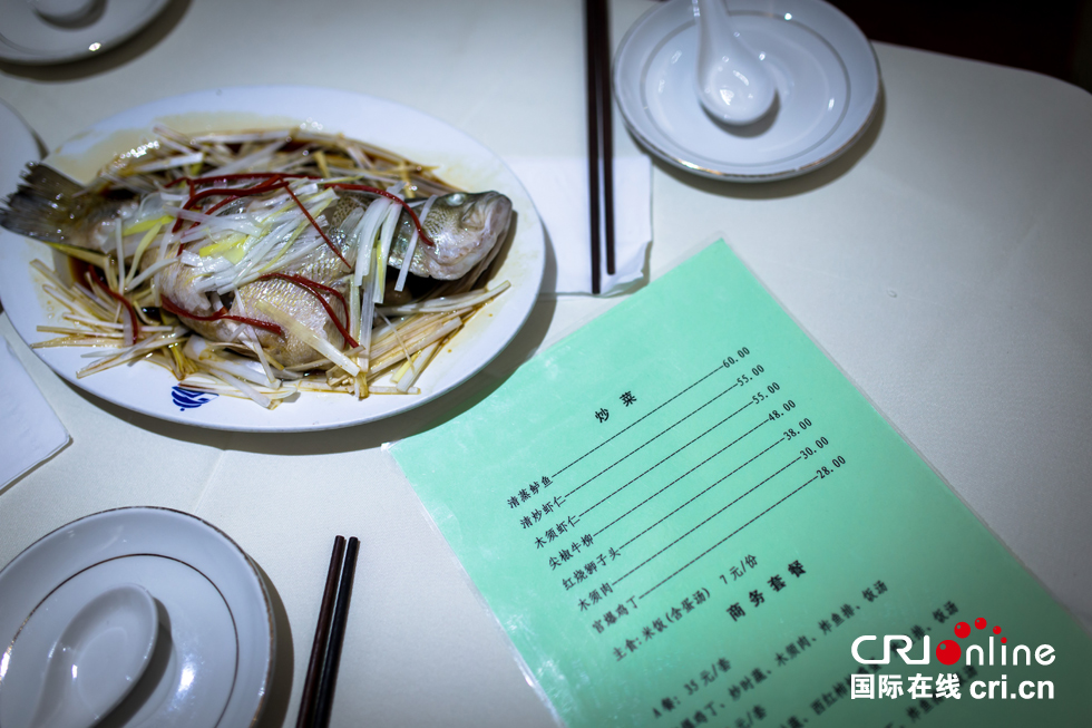 除了点套餐的旅客,还有很多单点菜品。清蒸鲈鱼是白师傅的招牌菜之一,因为这道菜也有很多回头客。图为白振庆师傅将准备好的鲈鱼放到蒸箱中。