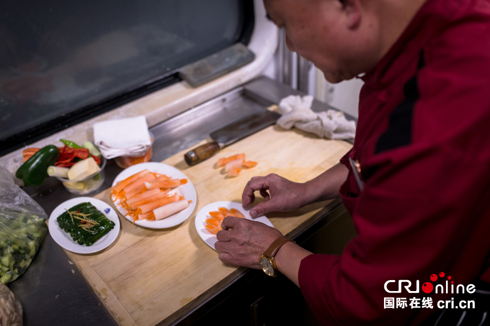 “有一名旅客,差不过每年春运都会坐这趟车从杭州出发前往海宁然后转乘高铁前往宁波,为的就是在我们车上吃一顿饭。”白师傅说。图为白师傅制作菜品。