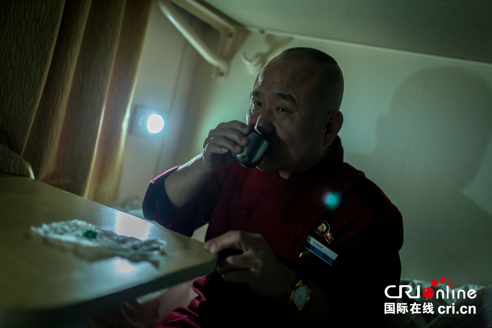 晚上11点多,大部分旅客已进入梦乡,白振庆师傅终于可以回到休息室稍作调整,但只能小睡几个小时,凌晨4点白师傅还要起来为旅客准备早饭。白师傅血压偏高,每天晚上都要吃药进行控制。