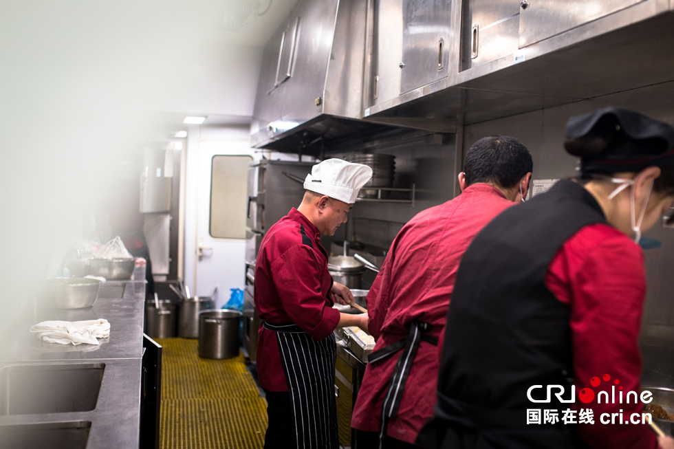 白振庆师傅说餐车上的厨师必须要手脚麻利,旅客可以在餐厅里久等一些,但是在餐车吃饭的都是急茬儿的。白师傅1980年开始在餐车工作,今年是他的第37个春运,在这37个春运中只有今年的除夕夜是在家过的。白师傅说在家过年当然高兴,不过在车上和旅客一起过年,为旅客做一顿可口的年夜饭更是一种责任。
