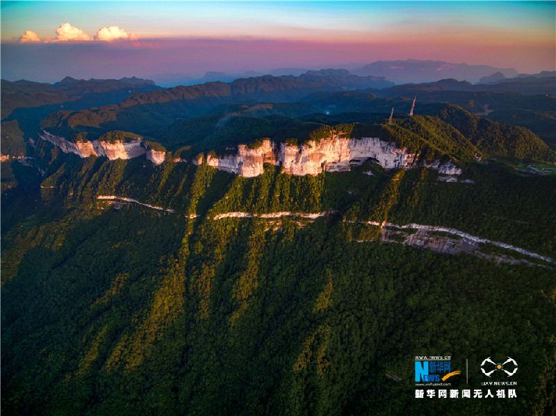 图为无人机航拍金佛山落日美景。山势雄奇秀丽,紫色的云彩旖旎迷人。新华网发 王正坤摄