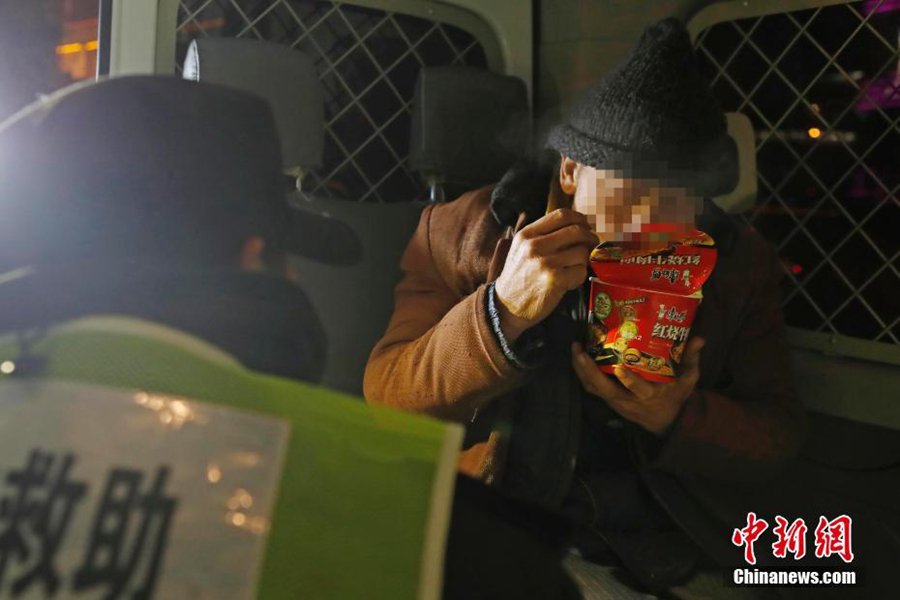 露宿街头人员在车上吃着泡面,准备前往救助站避寒。中新社记者 殷立勤 摄