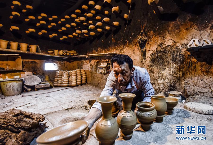 在喀什老城的家中,吐尔逊·祖农将刚制作好的土陶摆放整齐(3月14日摄)。新华社记者 赵戈 摄