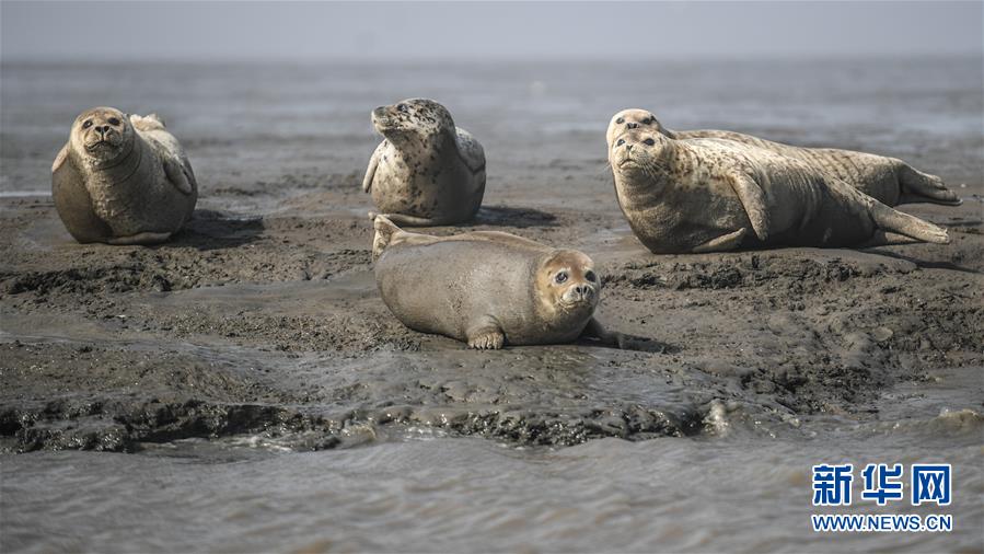 3月25日,几只斑海豹在辽宁盘锦双台河口三道沟海域的滩涂上休息。新华社记者潘昱龙摄