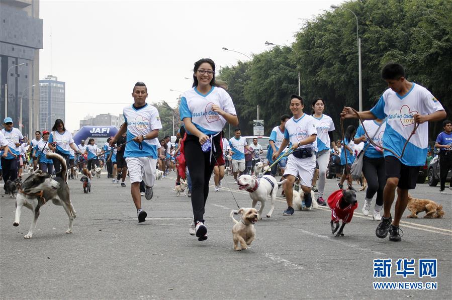 狗年新春将至,为大家展现一组热爱运动的“萌狗”。图为在秘鲁首都利马举行的一场有宠物犬参加的马拉松赛中,宠物犬在主人的带领下奔跑(2017年4月23日摄)。新华社发(路易斯·卡马乔摄)