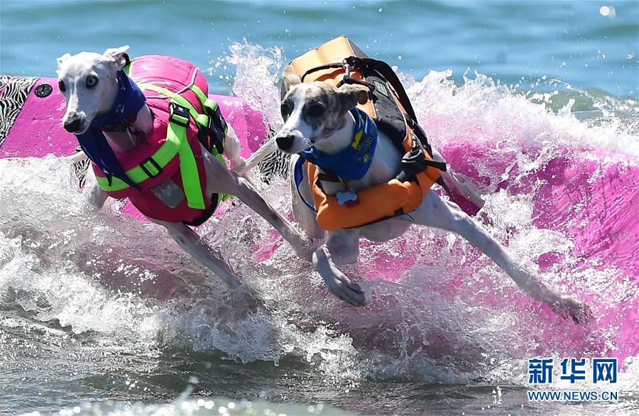 狗年新春将至,为大家展现一组热爱运动的“萌狗”。图为在美国加利福尼亚州的亨廷顿海滩举行的“冲浪之城冲浪萌犬”大赛中,一个冲浪爱好者带着他的爱犬一起冲浪(2015年9月27日摄)。新华社发