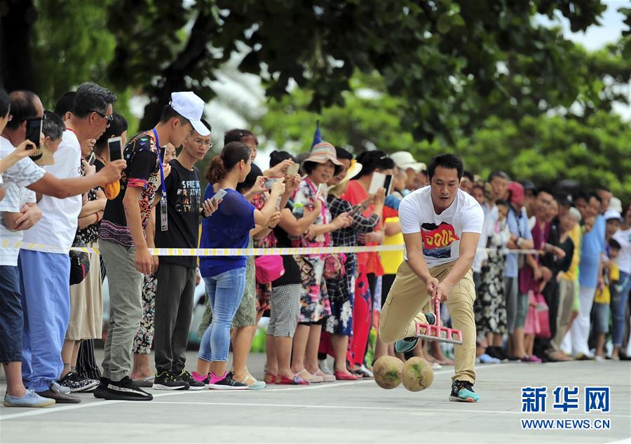 4月16日,在海南三亚,一名选手参加传统体育竞技赶“猪”赛跑。新华社发(沙晓峰 摄)