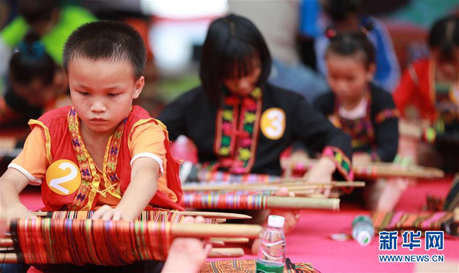 4月16日,在海南三亚,小朋友们参加黎锦编织比赛。新华社发(陈文武 摄)