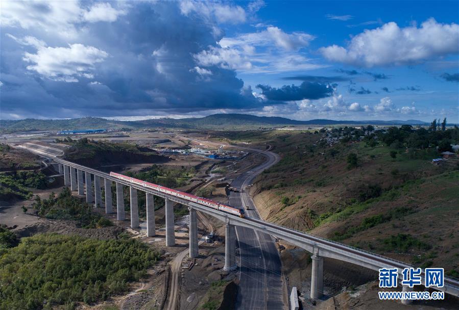 2017年5月12日,列车从肯尼亚蒙内铁路沿线的马泽拉斯铁路大桥上驶过。由中国企业承建的蒙巴萨-内罗毕标轨铁路(蒙内铁路)全长约480公里,2017年5月31日通车,东起肯尼亚东部港口蒙巴萨,西至首都内罗毕。新华社记者陈诚摄