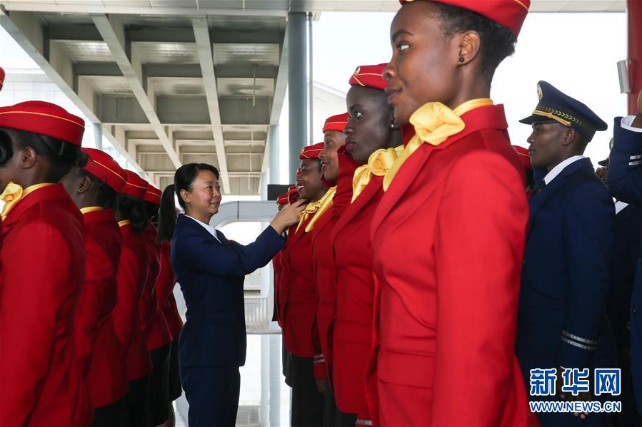 2017年5月16日,在肯尼亚蒙内铁路内罗毕南站,中方管理人员黄晓丽为列车员整理着装。由中国企业承建的蒙巴萨-内罗毕标轨铁路(蒙内铁路)全长约480公里,2017年5月31日通车,东起肯尼亚东部港口蒙巴萨,西至首都内罗毕。新华社记者潘思危摄
