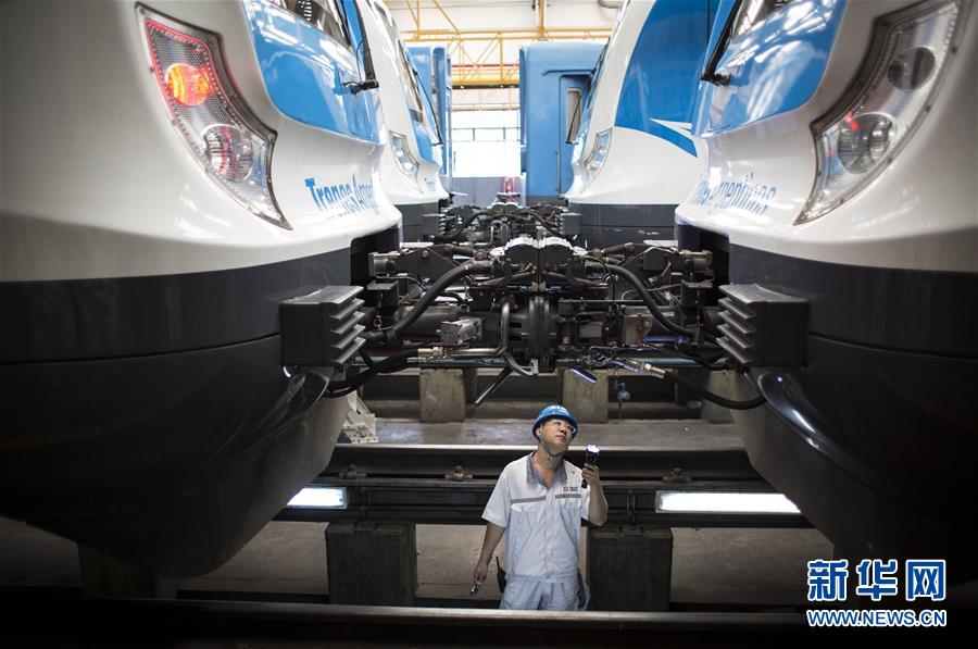 2017年4月11日,在位于阿根廷首都布宜诺斯艾利斯以南的利亚瓦略尔,中方技术人员检查为罗卡线城际铁路提供的列车。近年来,在阿根廷,中车制造的各种轨距、各种制式、各种型号的铁路机车、动车组、客车、货车和地铁列车密集交付。新华社发(马丁·萨巴拉摄)