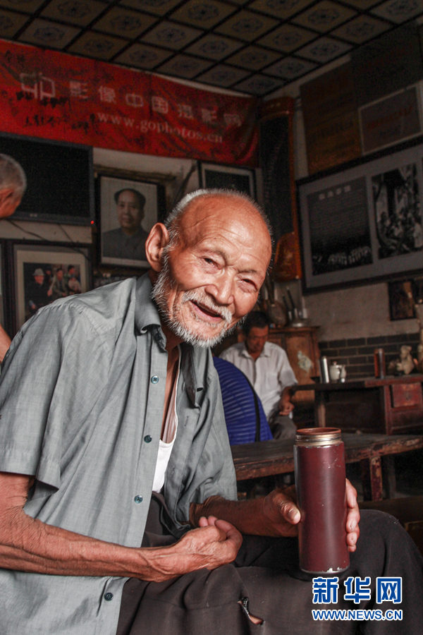 这位高龄94岁的老大爷,自小就跟随家人到茶馆喝茶。几十年来,他每天必到,清早的一杯茶已成为他的生活习惯和乐趣。新华网发(张恩水摄)