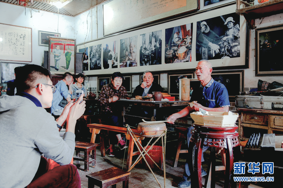 听书说书是茶馆重要文化之一,说的人津津乐道,听的人神情关注,淮北大鼓、坠子戏、泗州戏在此久盛不衰。新华网发(李绪林摄)