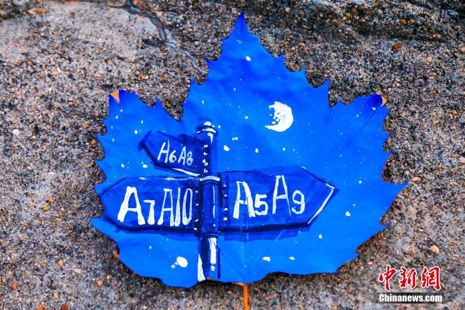 谈到创作思路,作品的主要负责人许嘉玲说:“今年的梧桐落叶格外好看,因而就想到要在叶子上画些什么?!毕敕ɡ寺导什僮髌鹄纯擅荒敲醇虻?,在选择画笔时她们就遇到了难题,“普通的马克笔不容易上色,而且颜色也并不鲜亮,水粉在绘制时又干的特别快,还容易掉渣,于是我想到了专业课上老师提到过的丙烯材料,试过之后发现它干得很慢而且不易掉渣?!?文/杨毅 图/许嘉玲