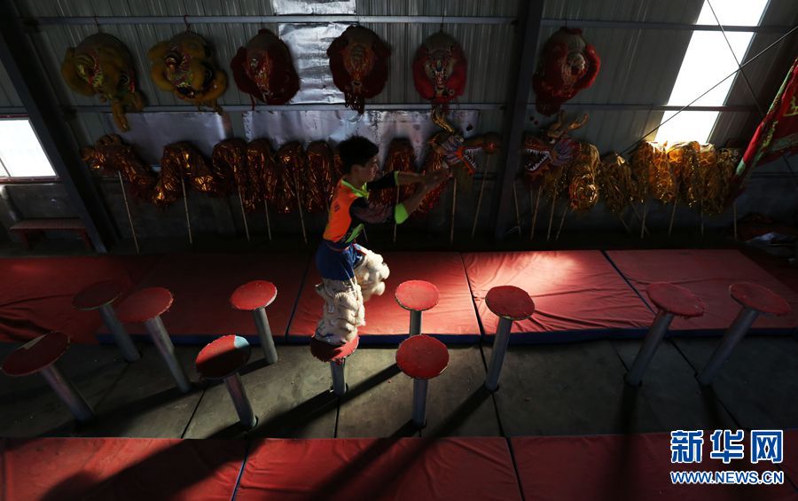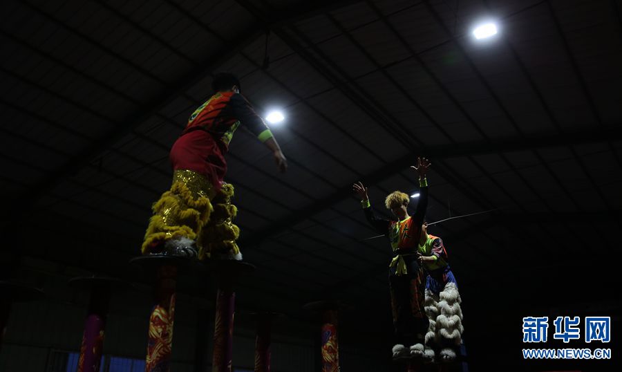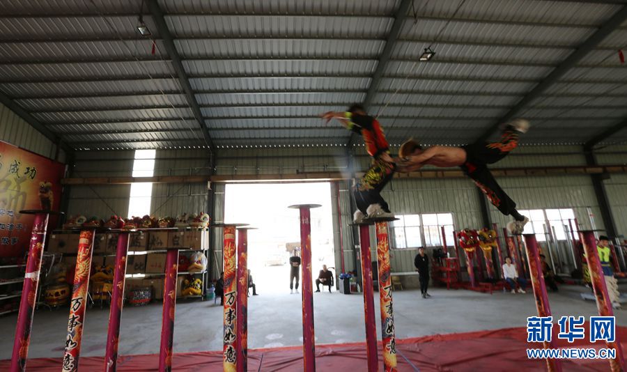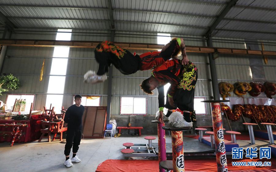 南狮主要套路有"采青" "高台饮水" "踩梅花桩"等。图为队员在庙会上进行高桩表演。