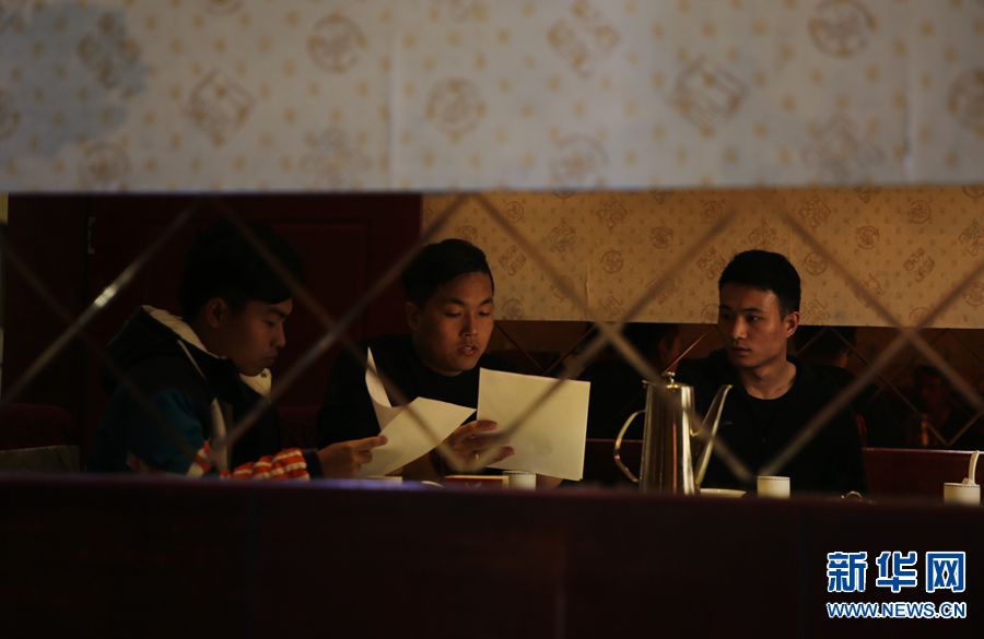 今年27岁的闫振宗(右一)在研究演出合同。他和王海斌在大学是一个舞狮社团,目前在队里负责后勤保障。