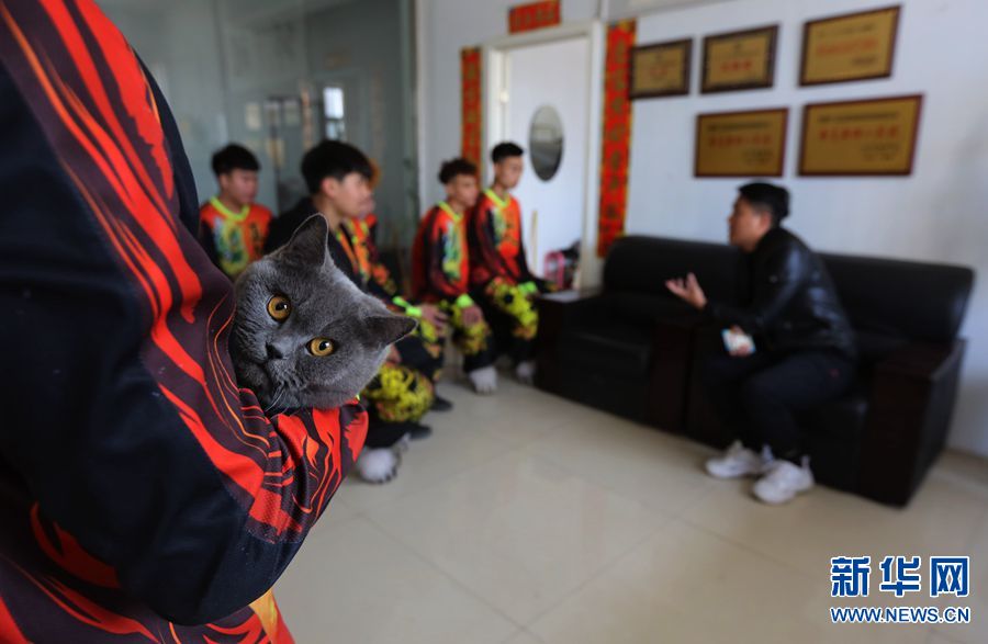 广东佛山的张文广(中)在指导队员进行训练。他说,老家几乎每个村里都有舞狮队,自己练习也有十几年,通过比赛认识了王海斌,如今在队里负责队员的日常训练。