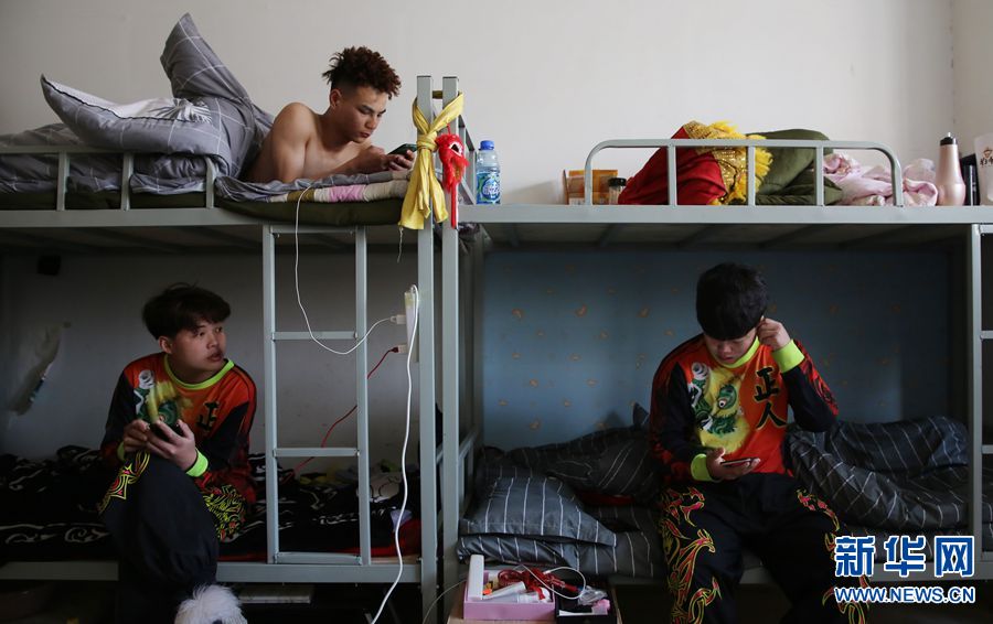 几名队员在宿舍玩手机。