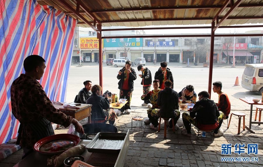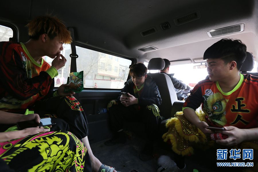 王永琪今年18岁,和“和尚”是武陟老乡,练习舞狮3年,他和“和尚”是“一对狮子”,大家喜欢叫他“五阿哥”。图为2019年3月16日,王永琪在演出路上给家人打电话。
