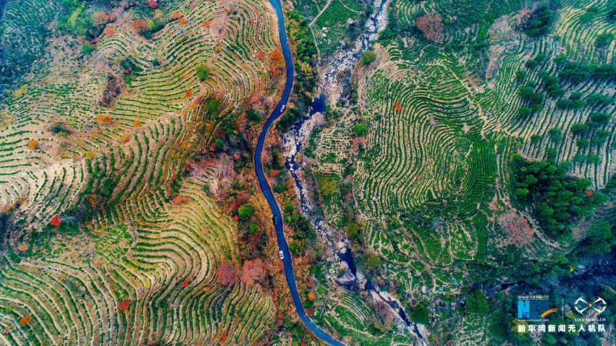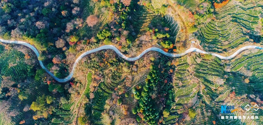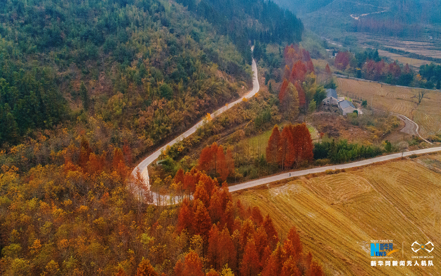这是11月24日航拍的安徽省青阳县陵阳镇黄石溪村周边的乡村公路。新华网发(陈磊 摄)