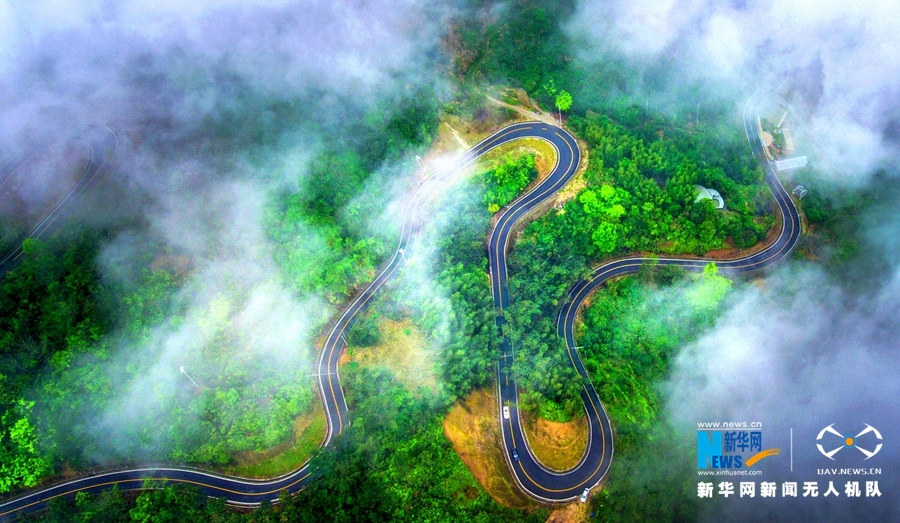 永春县仙夹镇的盘山公路在云雾中若隐若现,宛如仙境。新华网 王雄 摄 飞手 康庆平