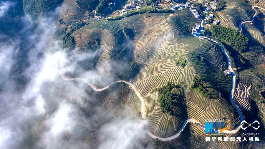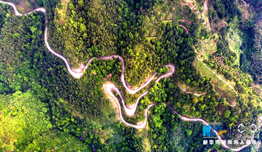 这是永春坑仔口镇通往洋头村的盘山公路,如一条丝带环绕茶山(无人机 拍摄)。新华网 王雄 摄 飞手 康庆平