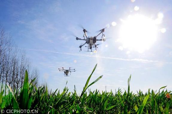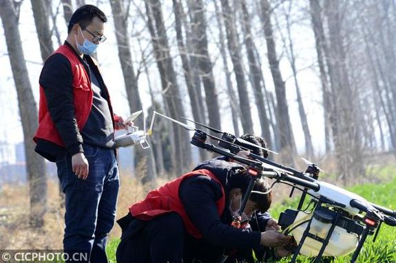 ↑2020年2月18日,在河南省汝南县三桥镇沙口村,衡会和同事操作的无人机在麦田喷洒除草剂。