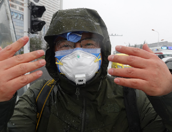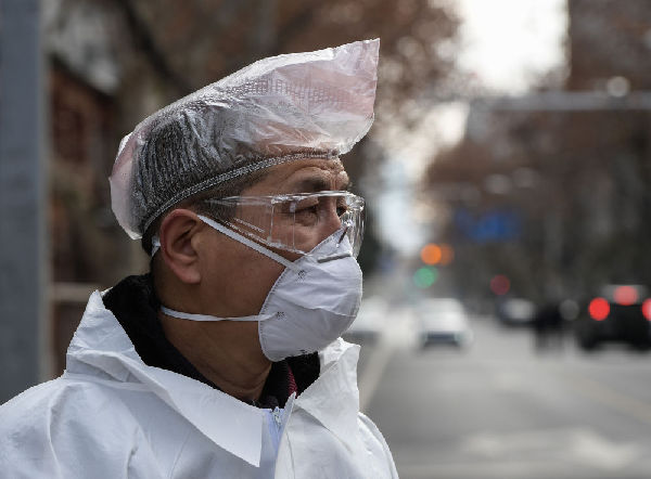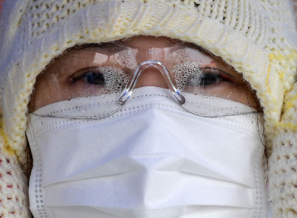 2月10日,一位武汉市园林局支援德望社区防疫工作的工作人员护目镜上被蒸汽水珠覆盖。