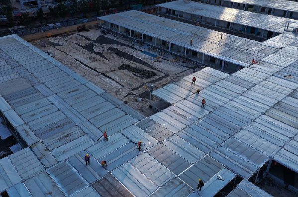 2月5日,工人在武汉雷神山医院病房楼顶进行施工作业。
