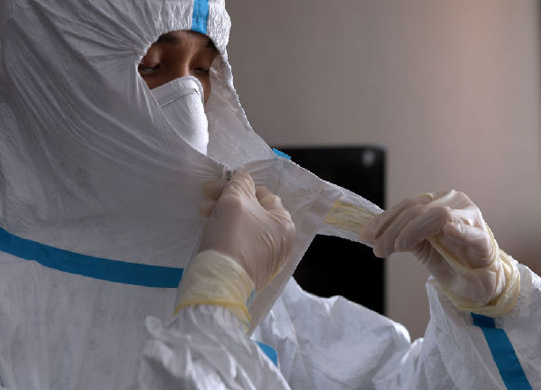 1月29日,一名来自北京安贞医院的医护人员在医疗队的武汉驻地练习防护服的穿脱,为进入“前线”救治病患做最后的准备。