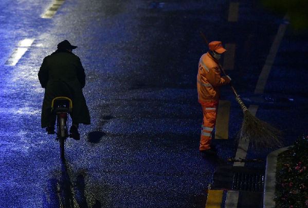 2月3日早5点,江岸环卫集团工作人员在武汉解放大道路旁进行清扫作业。
