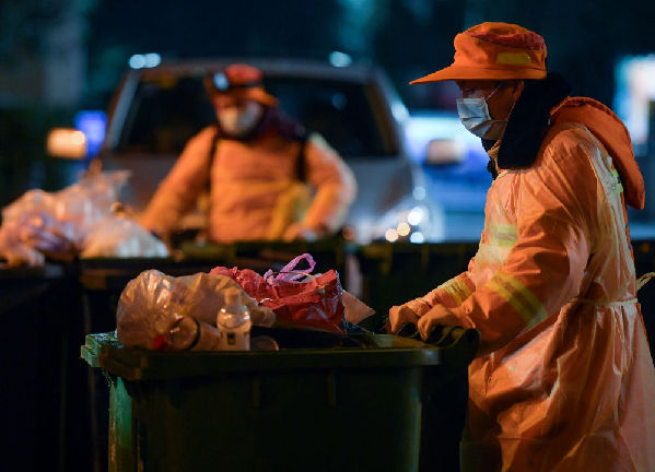 2月1日晚,一位江岸环卫集团员工在清运社区生活垃圾。