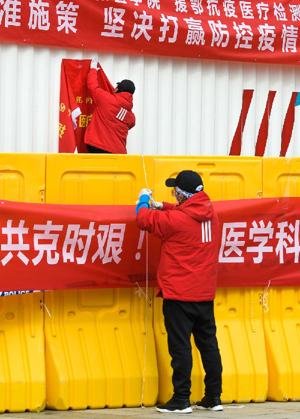 2月8日,两位工作人员在武汉客厅“方舱医院”外设置标语条幅和旗帜。