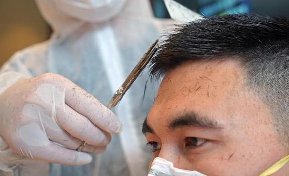 ↑2月24日,在汉口医院医疗队驻地,志愿者为医护人员剪发。新华社记者 李贺 摄
