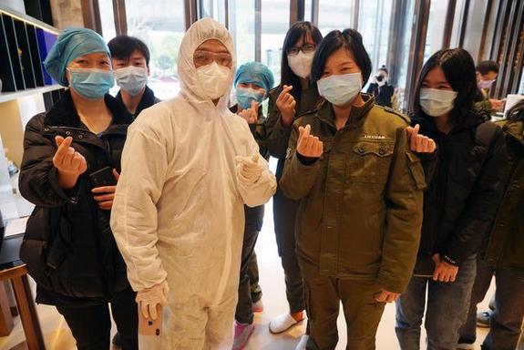 ↑2月24日,在汉口医院医疗队驻地,志愿者赵鹏程(穿隔离衣者)与医护人员合影留念。新华社记者 才扬 摄