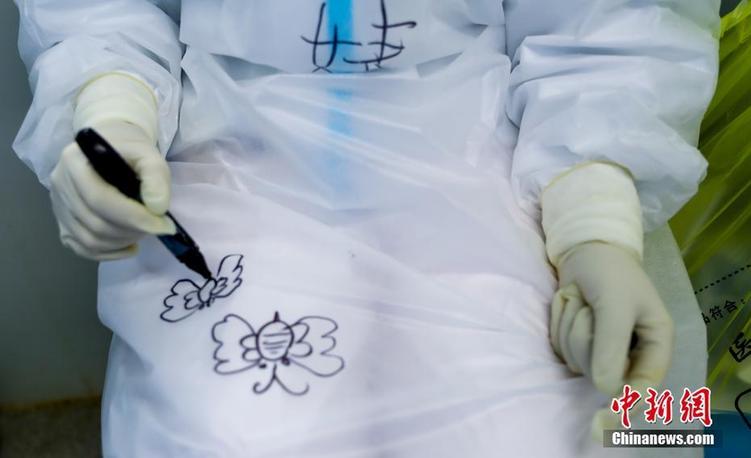3月2日,武汉火神山医院病区内,一幅幅励志漫画,一首首信心满满的诗歌,让原本素色冷清的走廊变得温暖起来,也传递着白衣战士们战胜疫情的决心和勇气。图为一名医务人员利用工作间隙在自己的防护服上作画。中新社记者 张畅 摄