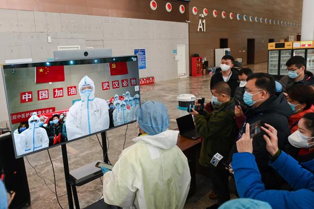 ↑3月6日,光谷方舱医院舱内患者和医生代表通过视频连线与舱外医务人员对话。