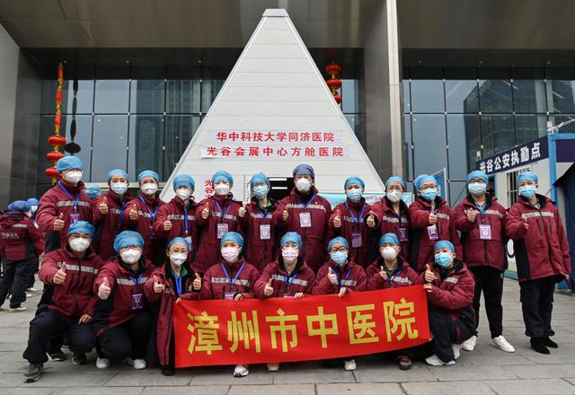 ↑3月6日,福建医疗队的医护人员在光谷方舱医院外合影留念。