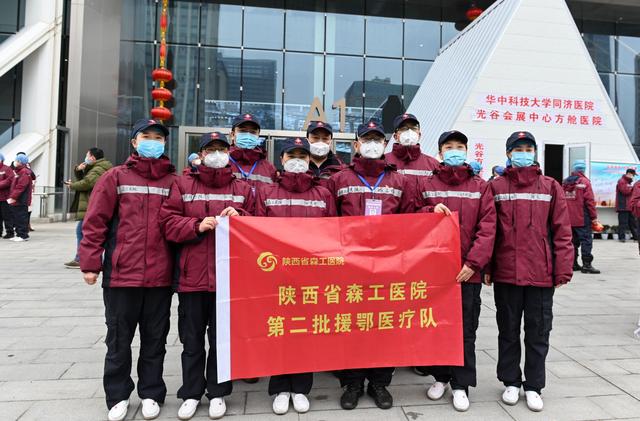 ↑3月6日,陕西医疗队的医护人员在光谷方舱医院外合影留念。