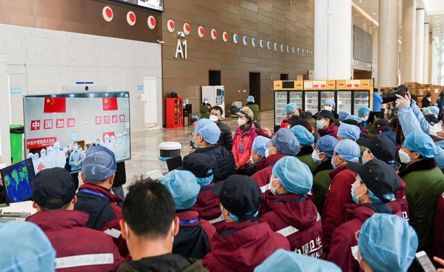 ↑3月6日,光谷方舱医院舱内患者和医护人员代表通过视频连线与舱外的医护人员等共唱《明天会更好》。