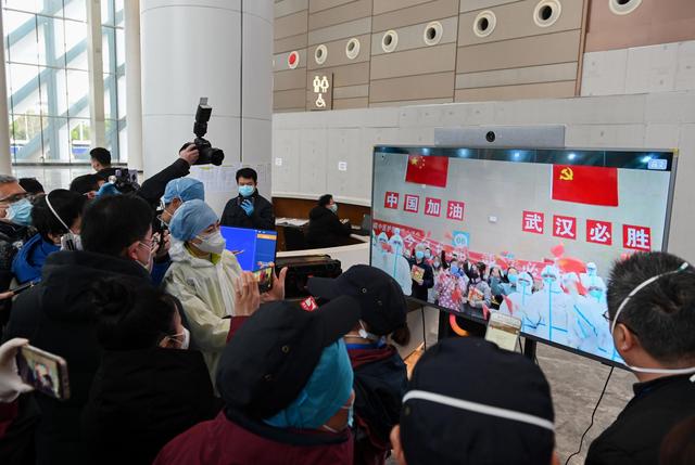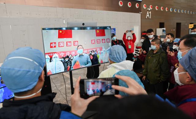 ↑3月6日,光谷方舱医院舱内患者代表与舱外视频连线,表达对医护人员的感激之情。